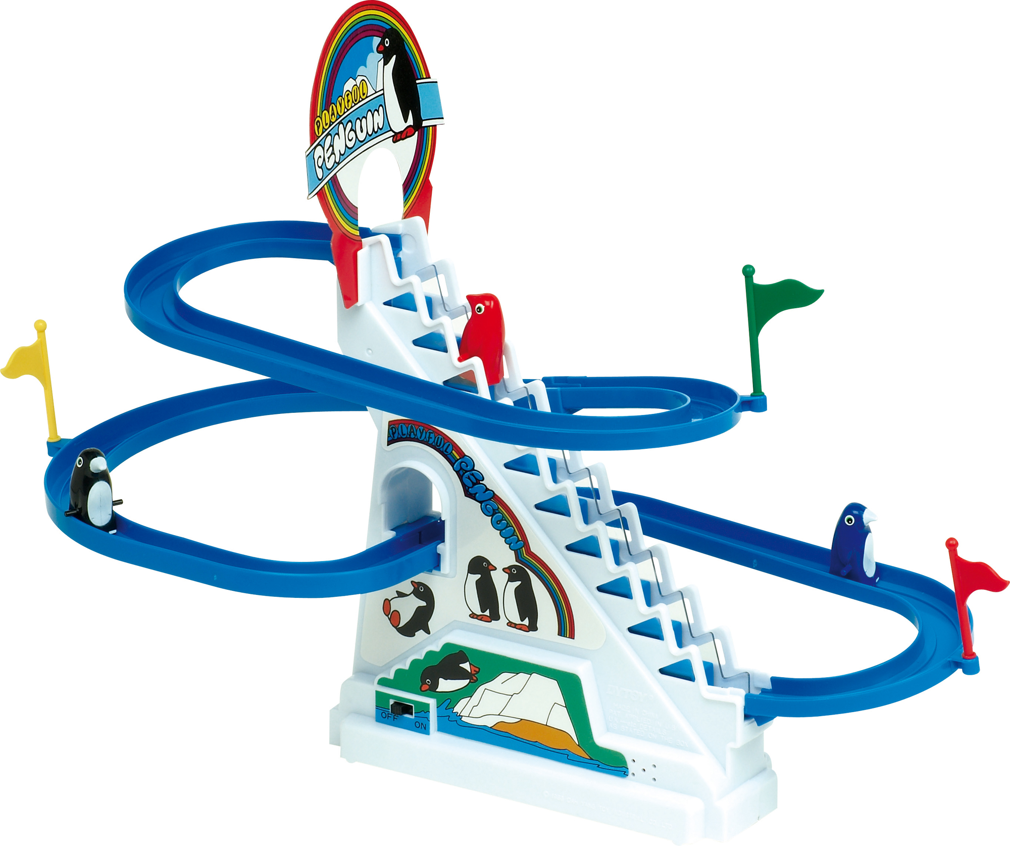 Les Pingouins remontent les escaliers puis dévalent la piste à toute vitesse!